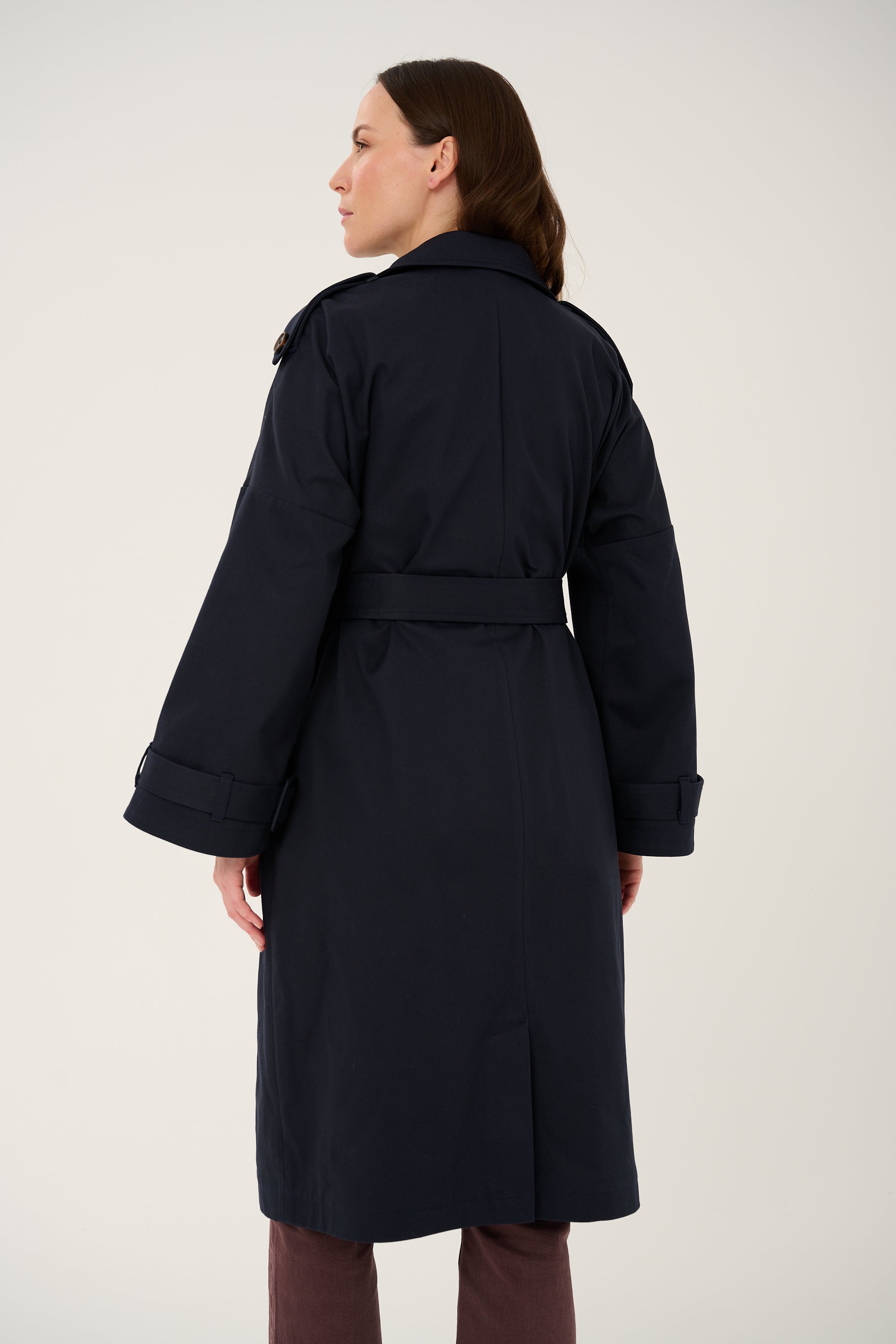 The "Nuit" trench coat is a navy blue cotton trench coat with kimono sleeves and contrasting plum-purple trim. The oversized fit ensures comfort, while elegant buffalo horn buttons add a natural touch. The limited-edition NUES collection combines conscious production, local craftsmanship, and everyday elegance to create a versatile trench coat for work, the city, and meetings.